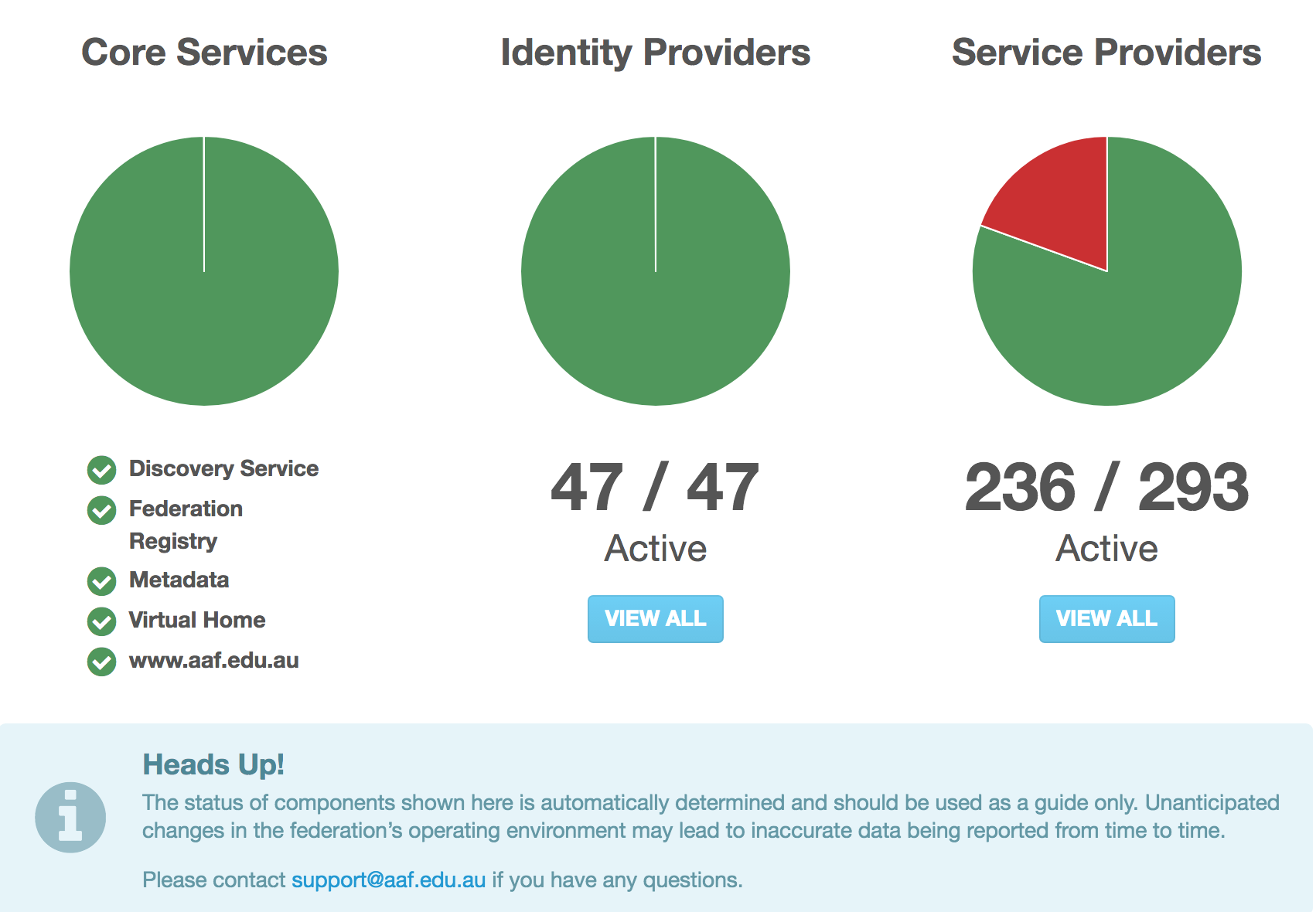 If there is no message or any service or system is UNAVAILABLE, DOWN or coloured RED, please contact your local Service Desk who will contact your IdP administrator within your institution or organisation or the AAF for assistance.